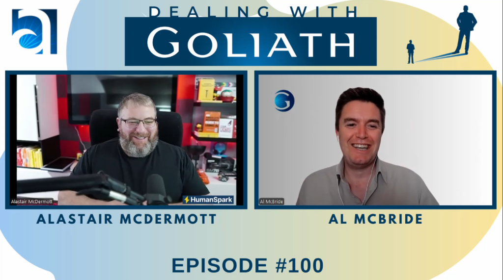 Welcome to the Dealing with Goliath podcast. Now we’re not going to do our usual intro, because this isn’t quite our usual episode. This is episode 100. I want to do something a little bit different. So the theme in this episode is about AI and the psychological edge. So for many of you who know me, maybe you have my book already, it’s called Goliath, similar to the podcast name, Dealing with Goliath, psychological edge in gaining the psychological edge in negotiation. And I think there’s a huge paradigm shift happening at the moment. Some people are well aware of it. Some people think it’s overblown. And this is something with AI, changing everything. And this is something that I want to discuss with my good friend, an AI expert, coach and trainer, Mr. Alistair McDermott. So Alistair, welcome back on the show. Great to have you here. Great to be here. And congratulations on 100 episodes. Yeah, you got there well before me. I started before you were far more disciplined about your output. But here we are. Yeah. So look, as you know, I’m big into this idea of the psychological edge. But there’s a huge amount of disruption already happening. We’re starting to see it in hundreds of different ways, not least a huge amount of companies, software companies, legal companies, financial companies, suddenly, quite significantly reducing an awful lot of their new hires. This is predominantly in the States yet. It doesn’t seem to have caught on in Ireland as much, a little bit less in the UK on the initial stats so far. But this is something for a lot of industries that’s coming down the pipeline. That question of why should I hire you when I can just ask you actually PT. So let’s dive in there. Let’s let’s talk about that. So if you don’t mind, we can start on that one. I saw in one of your blog posts, you said, and it’s a nice quote, if you work like a robot, AI will replace you. Can you talk us around that as to how people should be thinking about how they need to pivot or adjust their work or their work practices?